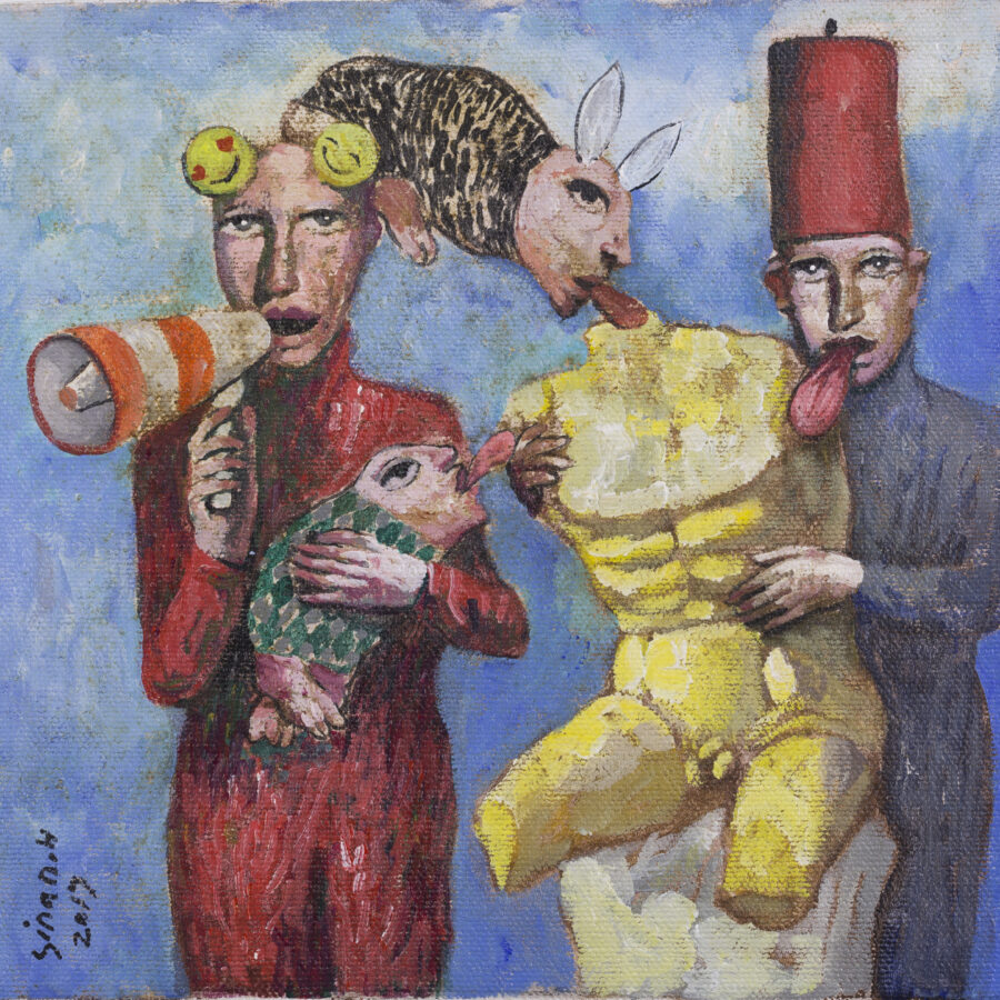 Born in Aleppo in 1972, self-taught artist Nihad Al Turk’s work focuses on the existential crisis of the individual caught up in power struggles between good and evil. Based in Beirut, Al Turk situates his work against a backdrop of literature and philosophy, painting a recurrent cast of mythical demons, outcasts, and antiheroes.